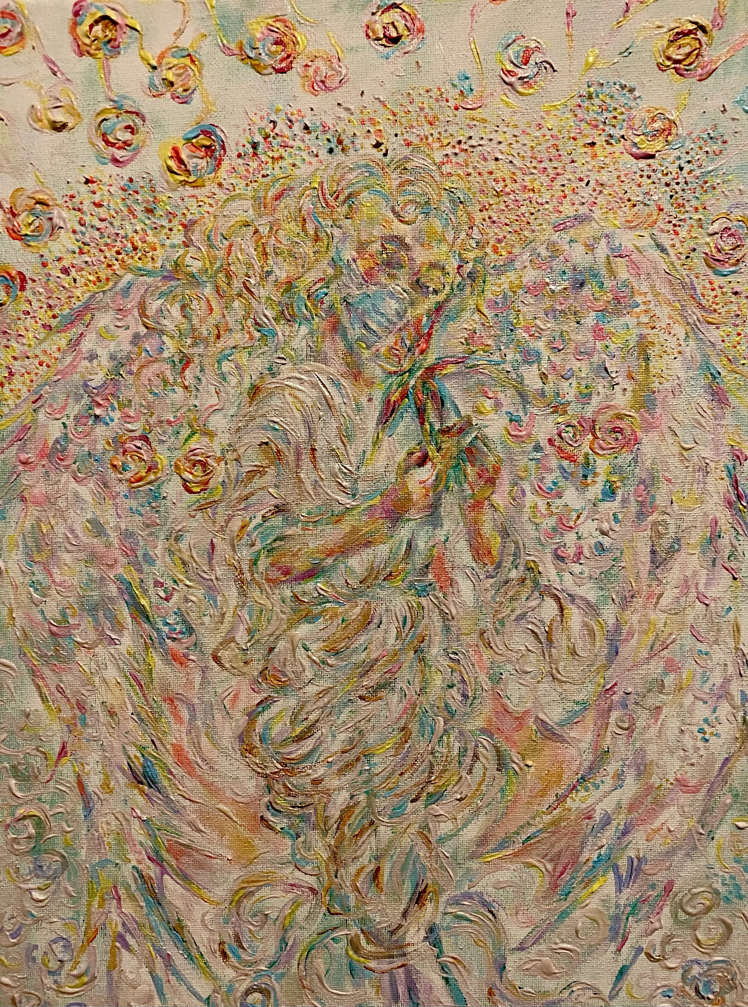 Statement: This painting depicts an angelic figure. The angel is holding a bouquet of flowers, and is pictured wearing robe painted with short energetic strokes. The angel is seen wearing a medical mask, as remembrance of covid. Above the angelic figure are floral elements painted with swirling strokes and stippling. The artwork is highly textured and it shares the qualities of both impressionism and pointillism. There is a use of thick impasto like brushstrokes, and swirls; creating a sense of movement. The palette consists of pinks, blues, and yellows. The intention behind this piece was commemorate the frontline workers who had sacrificed their health and wellbeing to help those who had fallen sick during the covid 19 pandemic.