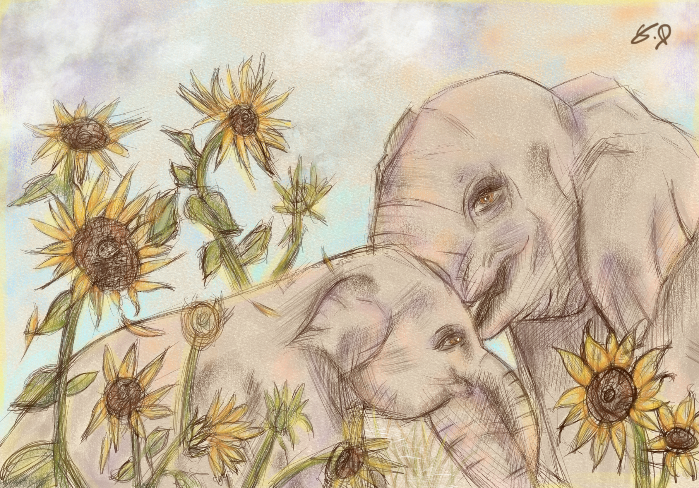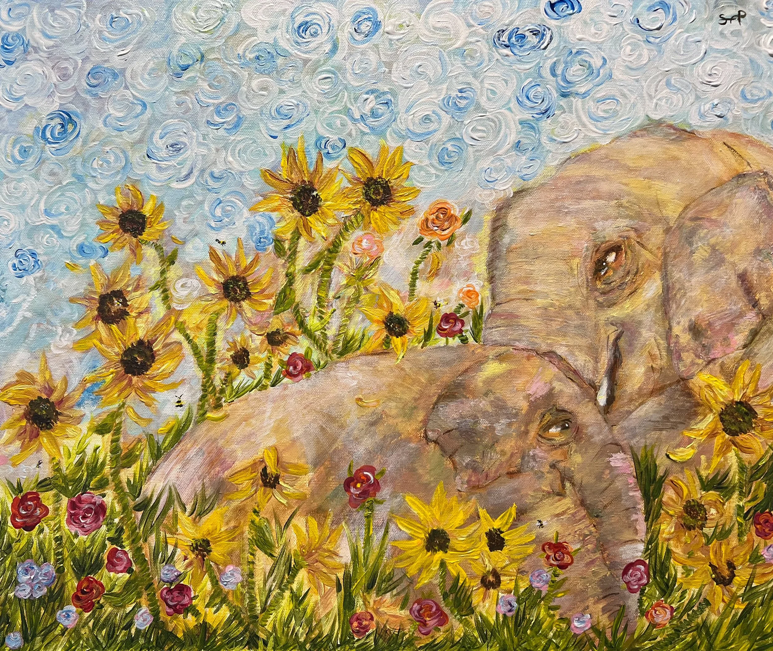 Statement: This painting depicts a stylized scene featuring two elephants in a field of vibrant sunflowers, roses and other vividly coloured blossoms. The backgrounds sky is fully painted with layers of white and blue swirls, taking inspiration from Van Gogh; this addition adds a movement to the scene. The foliage surrounding the elephants is painted with short expressive brushstrokes, reminiscent of impressionism. There is a focus on the emotional intimacy of the two elephants, showing the blossoming love between the mother and her calf.