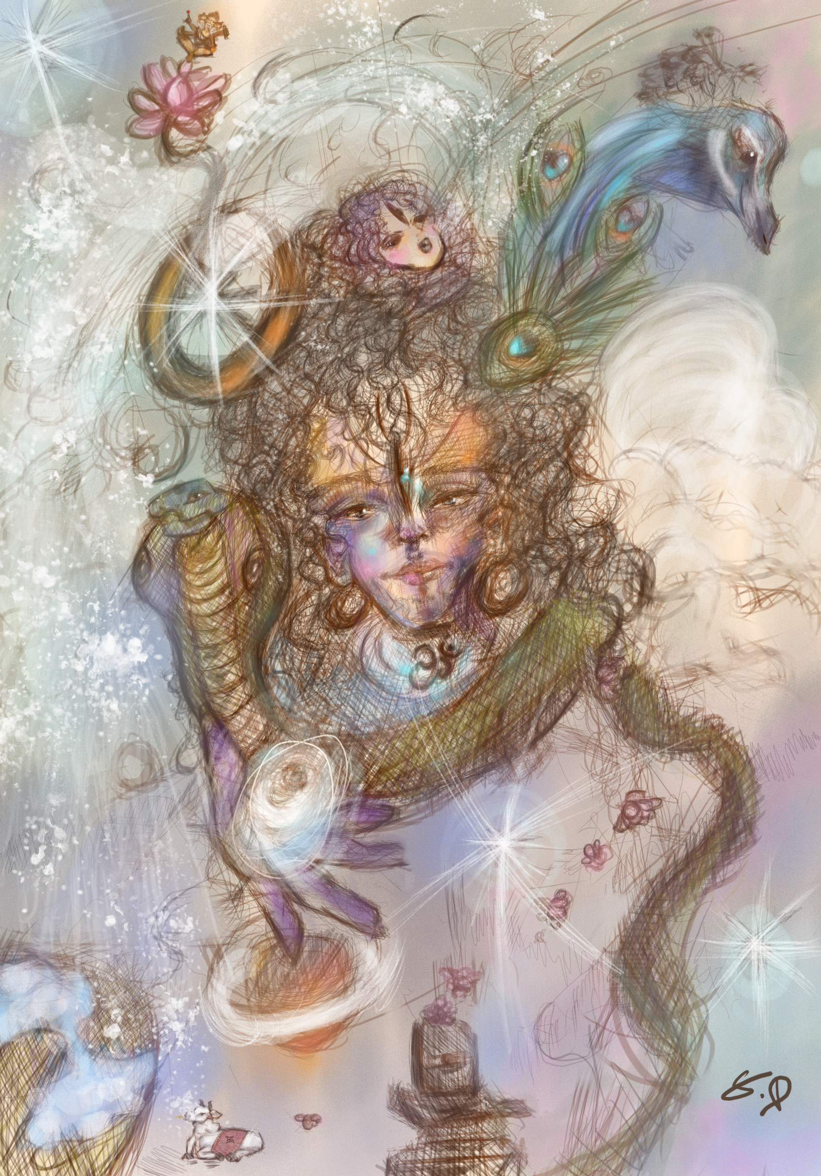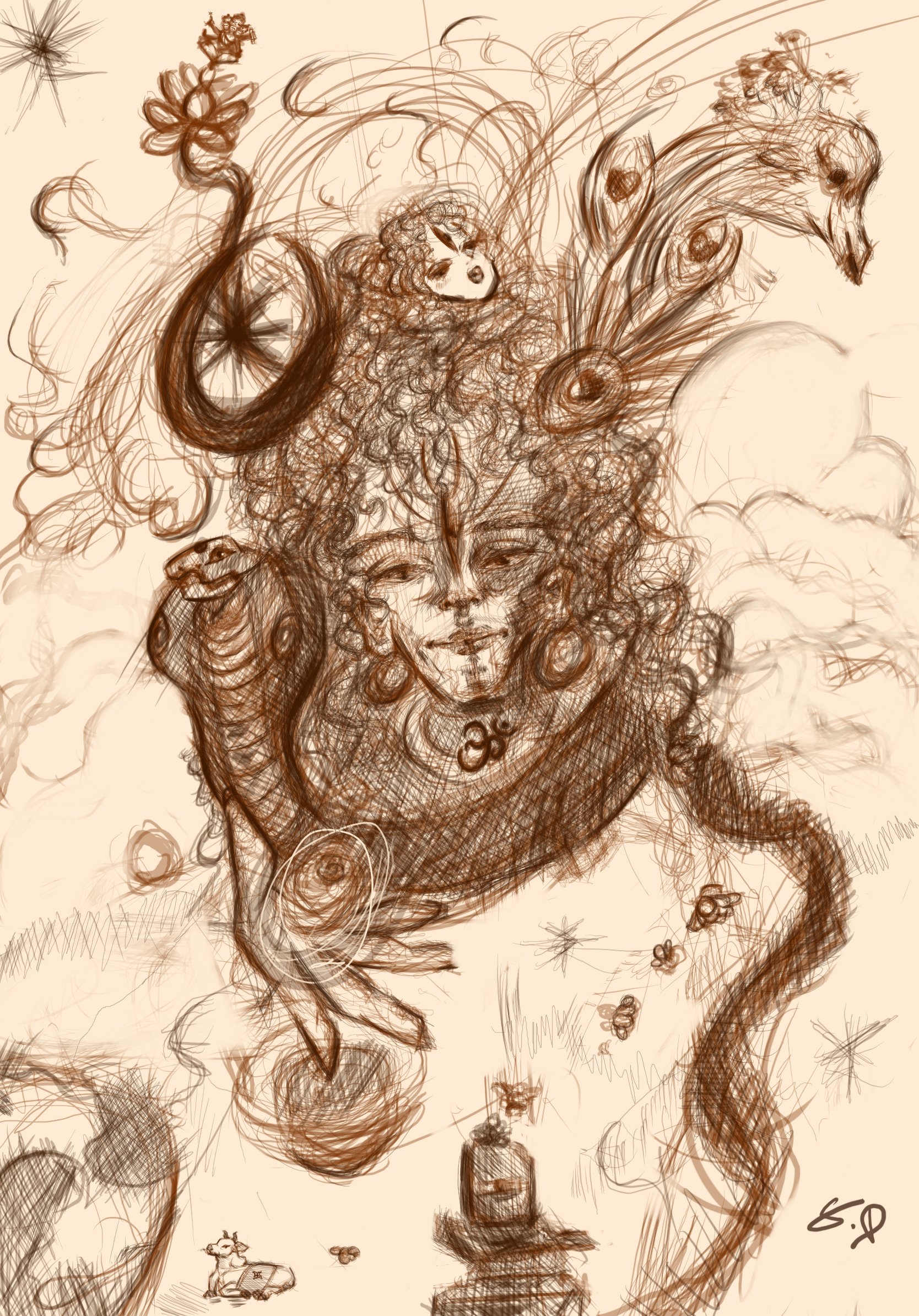 Statement: This illustration depicts both Vishnu (Hari) and Shiva (Hara) as one entity . It’s drawn with lose lines and cross — hatching, and the use of pastel colours. Aspects of Lord Shiva are shown through the incorporation of Vasuki, the king of the Naga’s. Further pushing the aspects of Shiva is Maa Ganga wrapped in the hair of Harihara. At the bottom of the image, there is a Shiva lingam a formless representation of Lord Shiva, as well as imagery of flower pedals being offered to the Lingam. At the top right of the image a peacock is shown which is an animal associated with Lord Vishnu. The holy trinity in its entirety is shown, with the depiction of Lord Brahma sprouting from the head of Harihara, showing God’s leela (divine play) in the cycle of the creation, preservation and destruction of our universe.