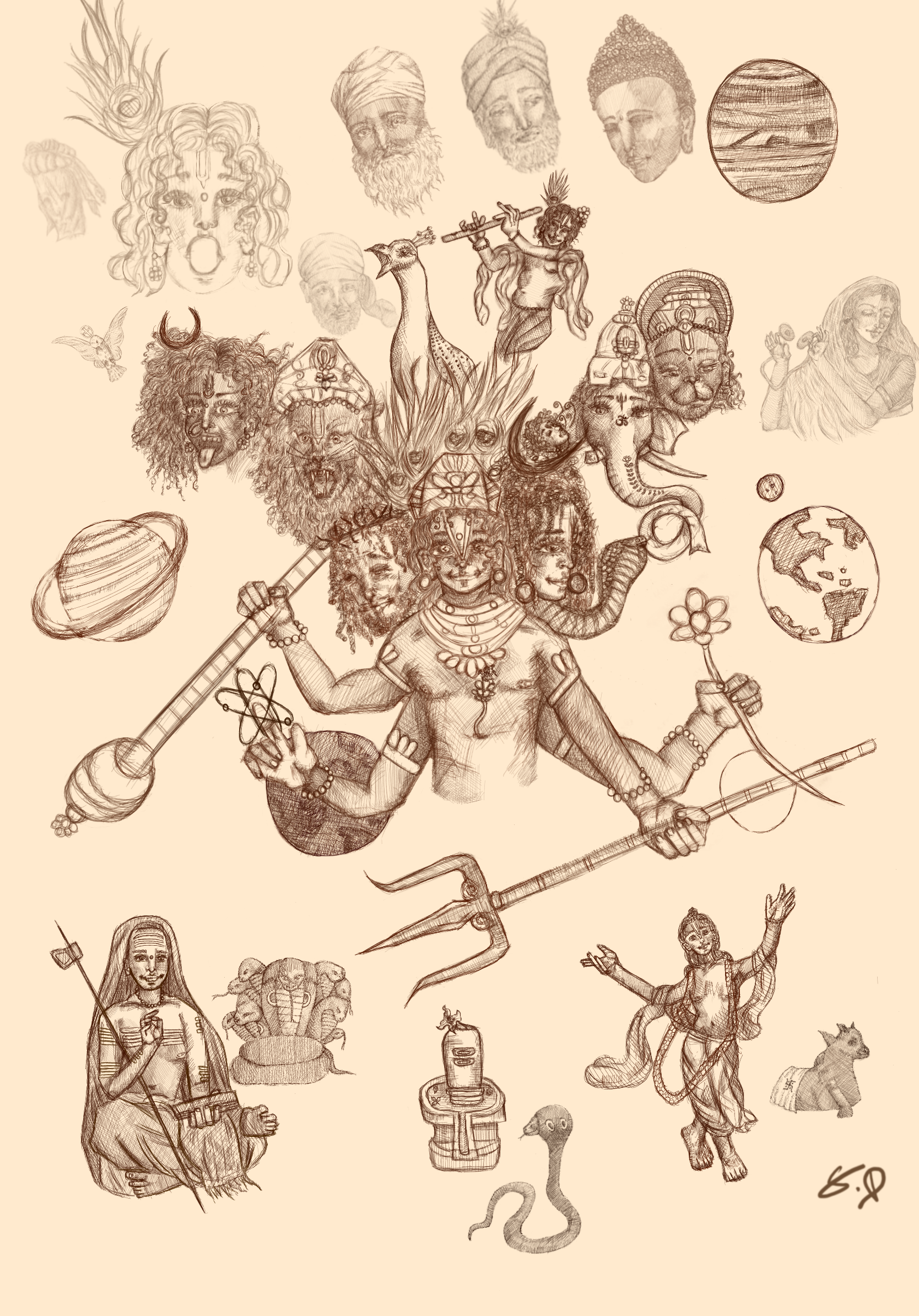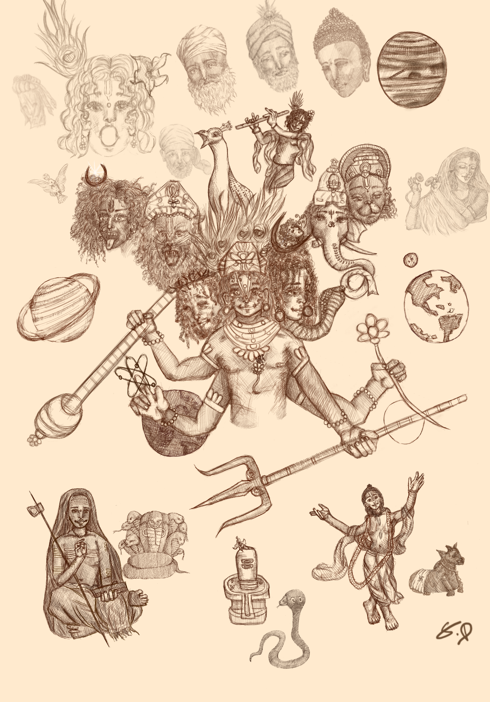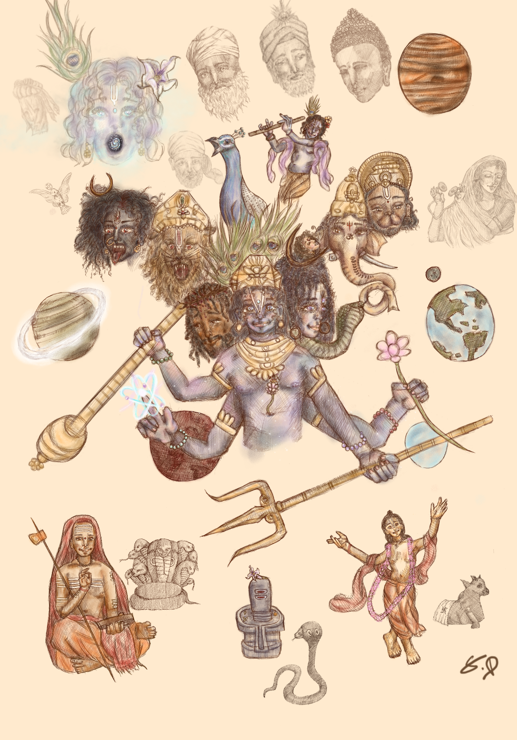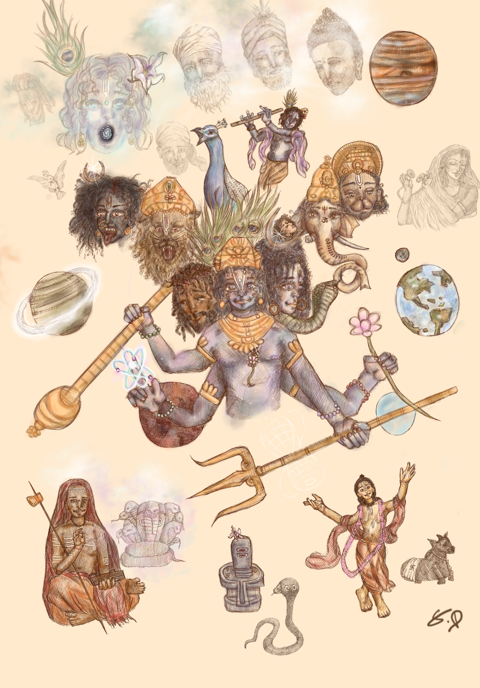 Statement: This artwork is a depiction of my philosophical truth. It is a declaration, a revelation seen through the eyes of those who liberate one’s self of their own inner ignorance, one who dares to look beyond form to perceive “tattva” (truth). At the center of the image stands a divine figure with many faces and many arms, which hold symbolic items. The divine faces merge the characteristics of Shiva, Vishnu, Kali, and more. This captures the essences of the cosmic function, creation, preservation, destruction, transcendence, time, and compassion. The many arms hold sacred symbols, the trishul of Shiva, the mace of Vishnu, the lotus of Laskshmi; and the incorporation of an atom representing modern science, connecting Vedic knowledge to modern science. The most profound elements of Tattva Darśi is the inclusion of the face of Jesus Christ beside Vishnu at the core of the image. It is not accidental or ornamental, but a statement. Vishnu is the sustainer of dharma, while the Christ is the very embodiment of sacrificial love. Together in this work they are not to be seen as rivals, rather to enlighten the message, that the divine works through many masks in order to deliver the same light. Tattva is seen as the ability to see the same divine essence in Christ and Krishna, a philosophy beyond religion. To the left side of this artwork, we see the fierce elements of the divine with the forms Kali Maa and Narasimha, connecting Vaishnavism and Shaktism. To the right side of the central figure we see the face of Shiva, Ganesha, and Hanuman. This captures the essence of Shaivism, connecting different sects of Sanatana Dharma that often be in debate with one another. This also connects the various aspects of the divine as Tattva.