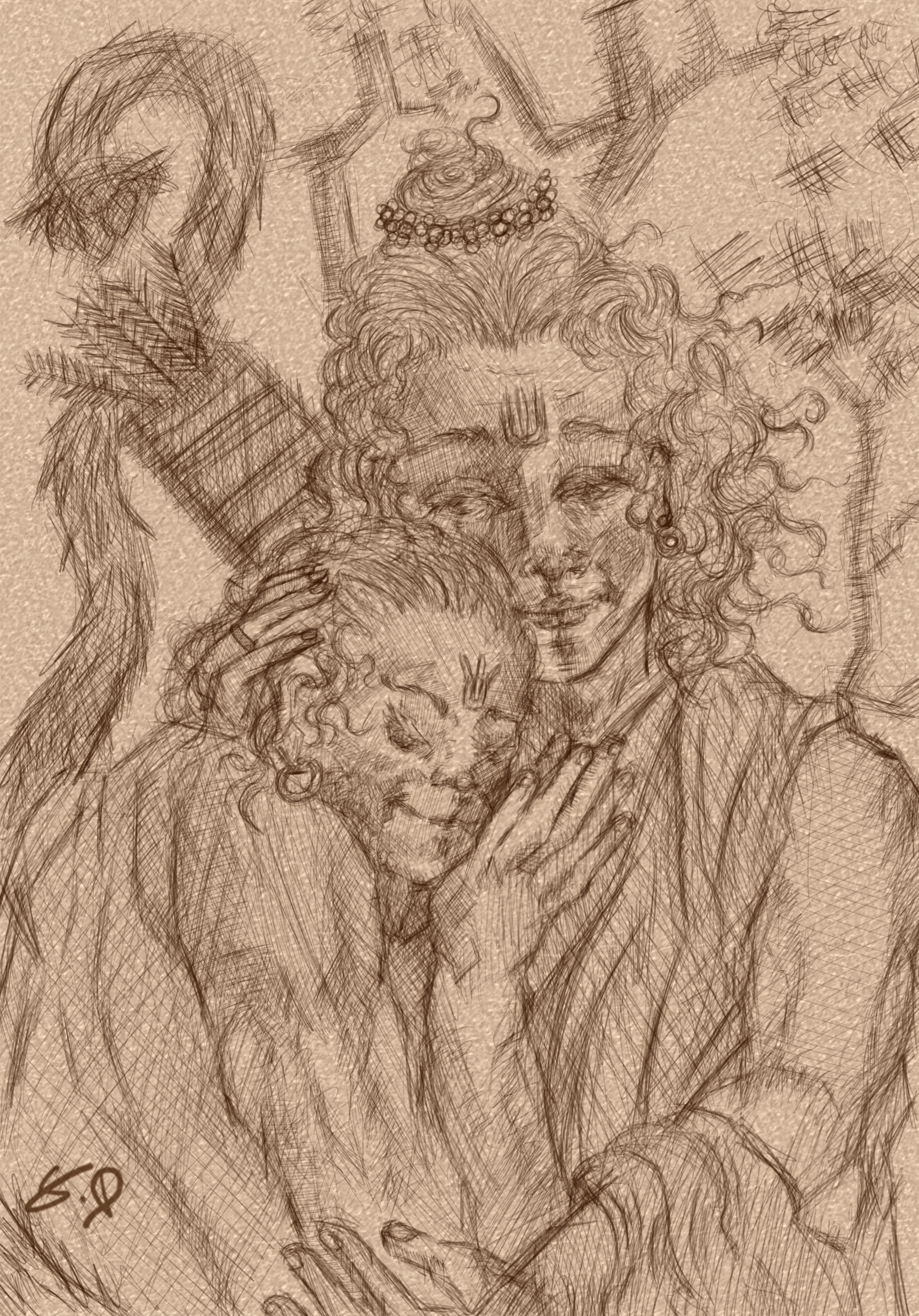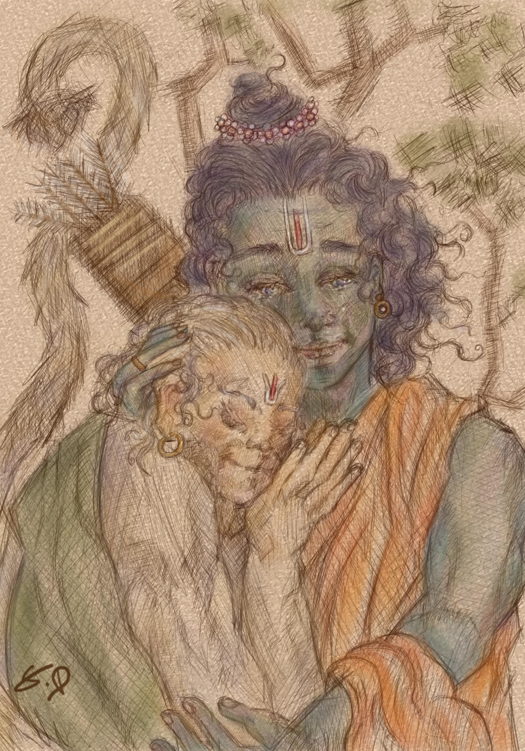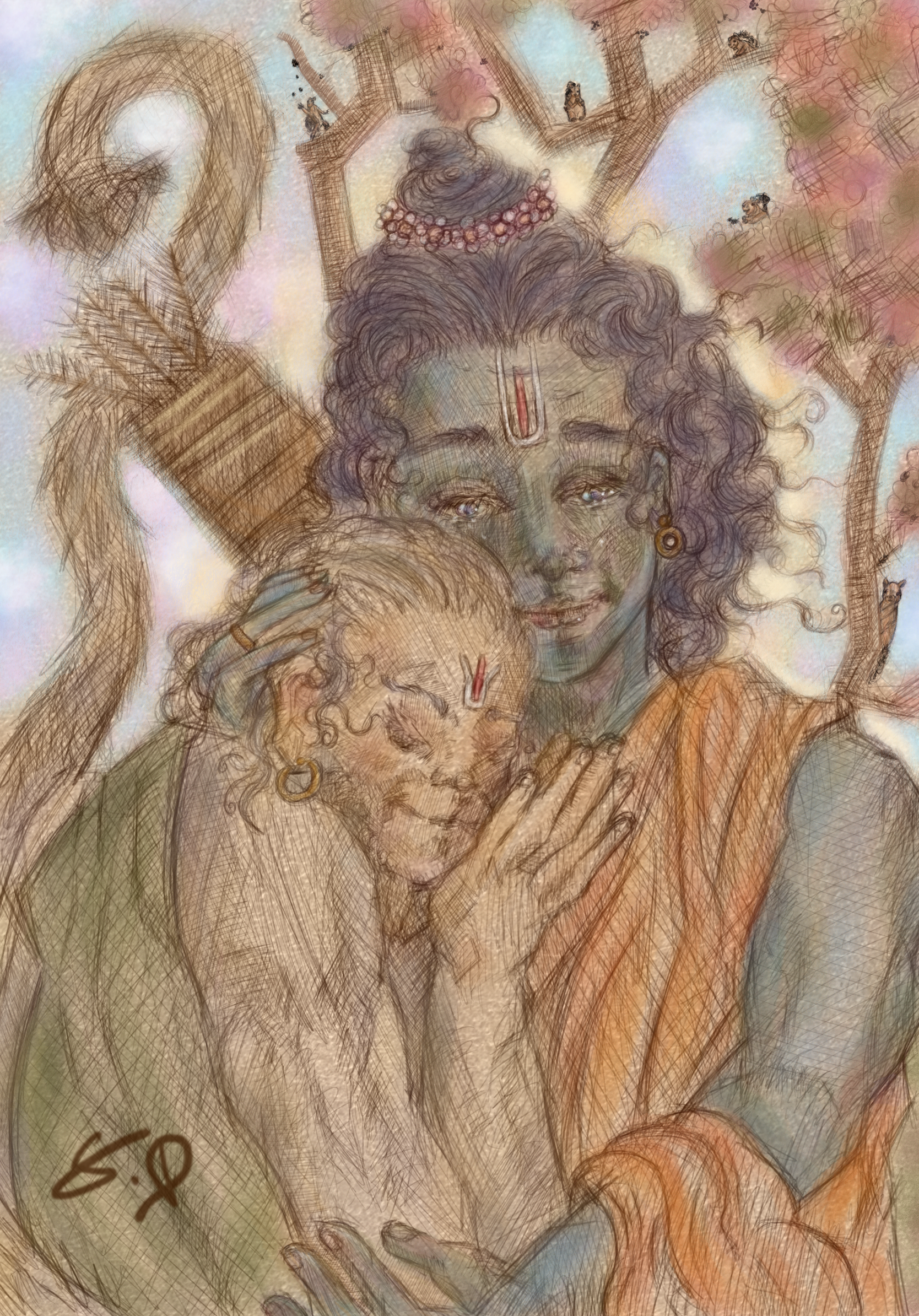 Statement: This artwork is a depiction of the divine devotion between Hanuman and Bhagwan Shri Ram. Hanuman bows not to just a man, but to the Supreme; Brahman in human form. Just as Christ is seen as God incarnate within Catholicism and Christian traditions, Lord Ram is seen as the embodiment of the formless Absolute within Sanatani worldview. Hanuman’s devotion represents our soul’s longing to merge with the divine through true selfless service of humility and unwavering love. Within this embrace, Hanuman finds the highest truth. Both Ram and Hanuman are not just worshiped in reverence of their divine nature, but for their commitment to Dharma; righteousness with the actions and the choices they have done. One as the ideal man and one as the ideal servant and knower of truth. Soft lines and a muted pastel floral colour palette make up this illustration, the palette is invocative warmth and (leela). This is not to be seen as merely an illustration of epic mythological characters, but as a reflection of a timeless truth. It is an offering of devotion and is a reminder that the ultimate truth is only realized through absolute love, love that sees the divine in form, yet knows it to be formless.